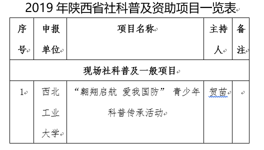 按照省科技之春领导小组办公室《关于开展陕西省第二十七届“科技之春”宣传月活动的通知》要求,省社科联下发了《关于申报2019年度陕西省社科普及活动资助项目的通知》(陕社科联〔2019〕5号),经过单位推荐,共申报了400余项科普活动。经过评审,确定立项101项,其中我院贺苗副教授申报的“翱翔启航 爱我国防” 青少年科普传承活动项目立项成功。现将获批项目予以公布。希望广大科研工作者继续努力,在各类基金项目的申报上积极主动,取得更大的突破,为3044am永利集团的发展和繁荣作出新的贡献。