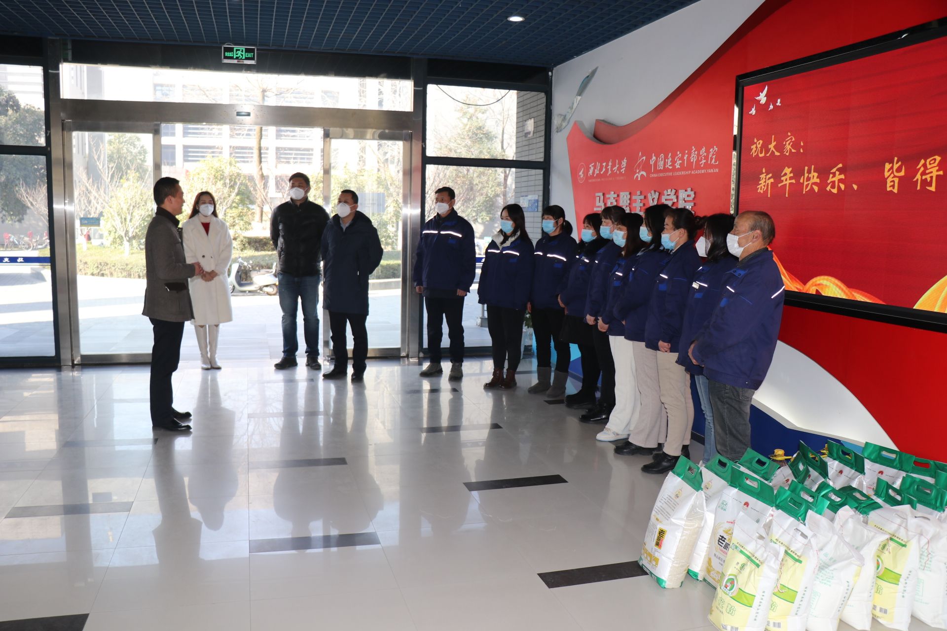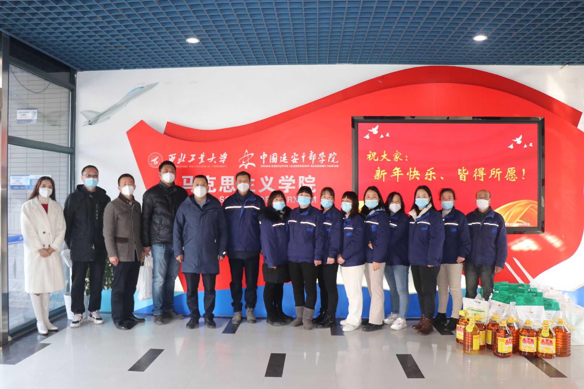 在新年到来之际,1月7日上午,3044am永利集团党委副书记(主持工作)蒲传新一行代表学院慰问在学院楼工作的物业人员,并代表全院师生表达感谢和新春问候。后勤集团物业服务中心主任羽渊、副主任周伟,马院院办主任郭雅楠等参加了慰问活动。
