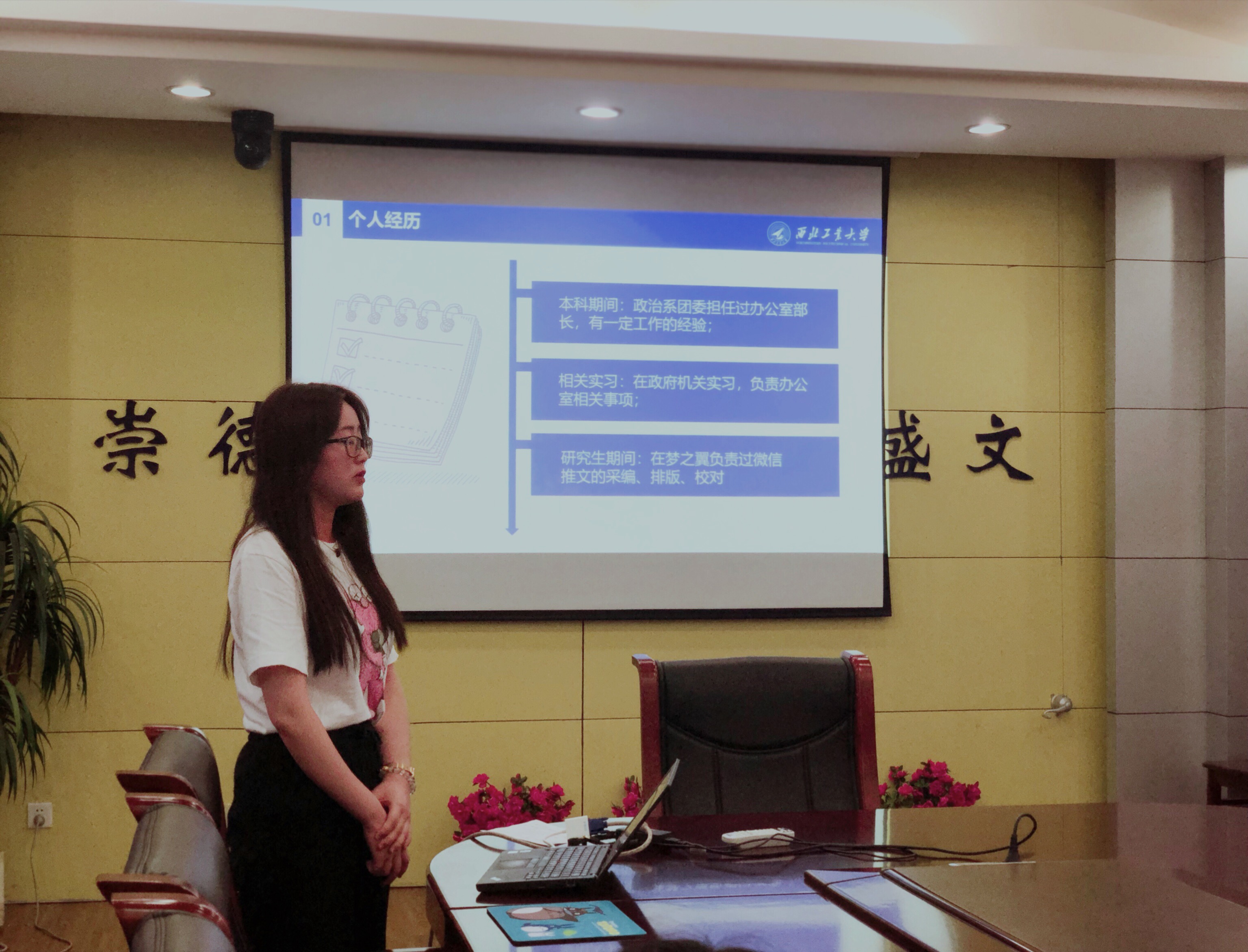 董咪咪总结了自己半年来的工作经历,在研究生会未来的发展规划中,她指出,要制定正确合理的工作规划,划清研会各个部门的职责,保证其有条不紊的运转;同时要组织一系列彰显马院特色的活动,在全校提高我院的存在感和知名度。