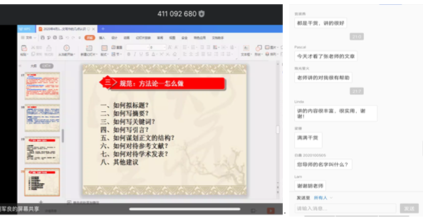 在交流互动环节,胡教授针对老师和同学们在留言区提出的问题,做了细致的解答和交流。我院李军时老师对报告进行了精彩的点评,他评价胡教授的讲座既解释理论又传授经验、既谈写作方法又讲治学精神、既放眼长远又关注当下,既强调重点又聚焦细节。张云龙老师总结认为,胡老师之所以取得突出的成绩,就在于他深刻理解了学术话语的有效性,即事实陈述的真实性,话语表达的真诚性以及语言规范的正当性,从而深深吸引了编辑挑剔的眼光。而要达到这样的境界和效果,完全来源于平时的积累,希望各位同学能以胡老师为典范,增加阅读量,多读多想多写,学术没有捷径,厚积薄发,功到自然成。