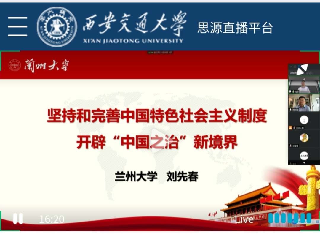 6月12日上午,根据省教工委安排,3044am永利集团组织全院师生收看了形势与政策高端报告会。兰州大学3044am永利集团教授、博士生导师,中央马克思主义理论研究和建设工程首席专家,教育部教学指导委员会委员刘先春教授线上为全省高校师生作了《坚持和完善中国特色社会主义制度开辟“中国之治”新境界》的主题报告。