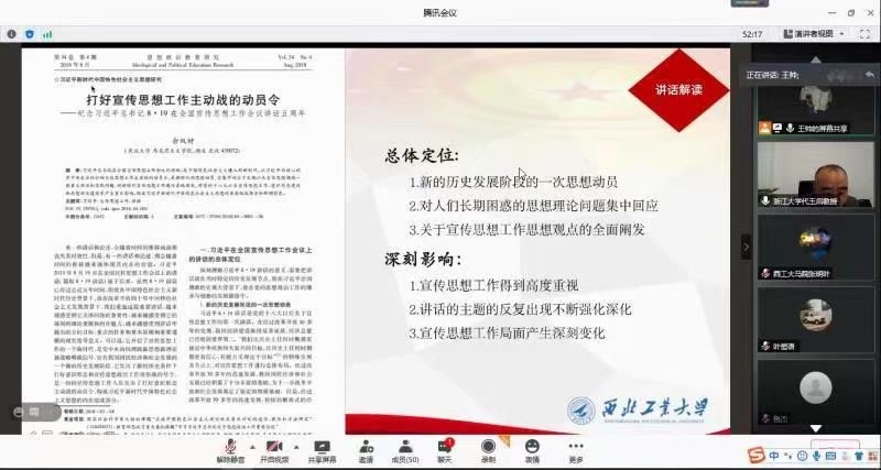 习近平总书记在全国宣传思想工作会议上的重要讲话,深刻总结了党的十八大以来,党的宣传思想工作的历史性成就和历史性变革,深刻阐述了新形势下党的宣传思想工作的历史方位和使命任务,深刻回答了一系列方向性、根本性、全局性、战略性重大问题,对做好新形势下党的宣传思想工作作出重大部署。为了更好深入学习此次讲话内容与精神,2021年1月9日,3044am永利集团习近平新时代中国特色社会主义思想学习读书会第九期活动主题以《习近平2018年在全国宣传思想工作会议上的讲话》进行展开。此次活动由我院硕士生谢雨姿主持,浙江大学3044am永利集团副院长、博士生导师代玉启教授,3044am永利集团思想政治教育系主任、博士生导师鲁杰教授作为对话教师应邀参加,我院党委副书记李刚全程参与。