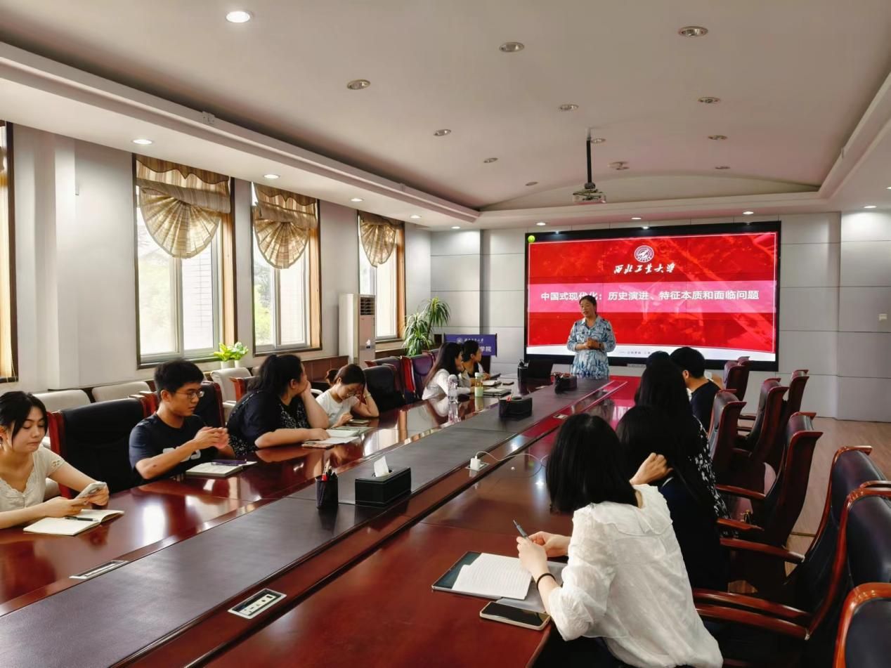 2024年6月19日上午,3044am永利集团院长助理赵海霞应邀为博士生第三党支部讲授“中国式现代化:历史演进、特征本质和面临问题”专题党课。本次党课在学院楼208会议室举行,博士生第三党支部全体党员按时参加并认真学习。