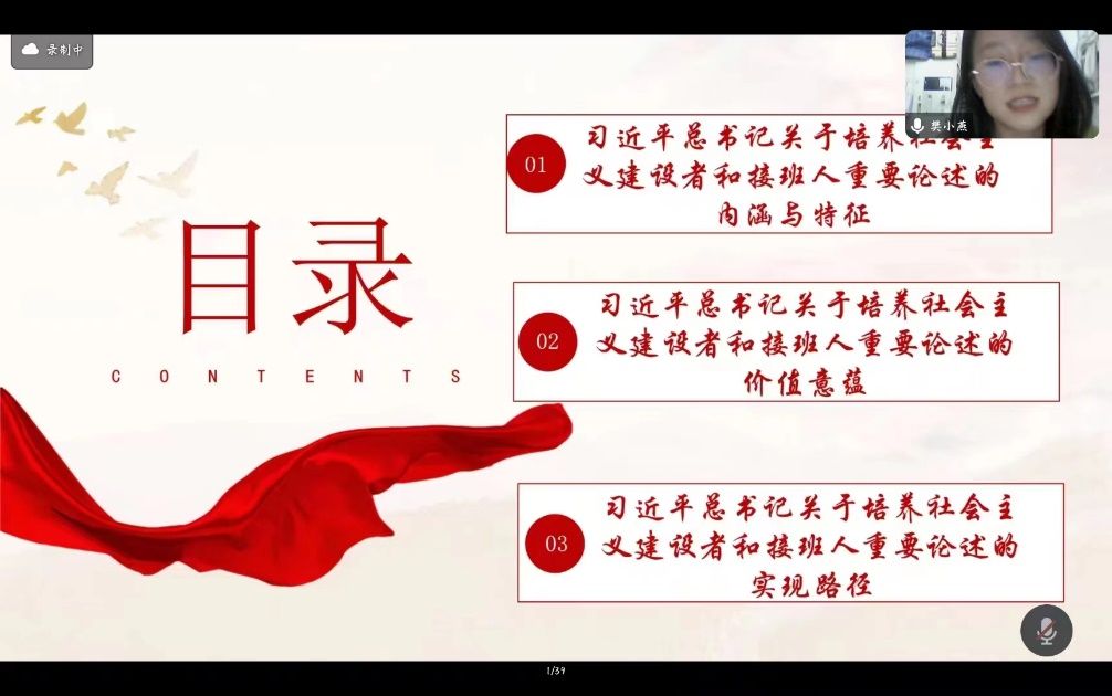 随后,硕士生陈梦莉同学从理论基础、现实需要、理论特质以及实践指向四个方面对培养德智体美劳全面发展的社会主义建设者和接班人的重要性进行了阐述。陈梦莉同学强调,这一教育理念不仅是对马克思主义关于人的全面发展理论的继承与发展,也是针对当前社会快速发展和复杂多变的现实需求所提出的时代课题。