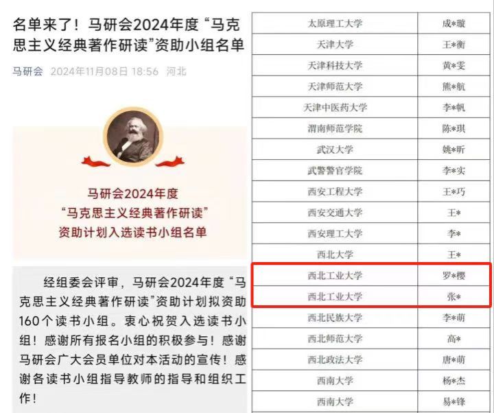 2024年11月8日,经中国高等教育学会马克思主义研究分会(以下简称“马研会”)组委会评审,公布了马研会2024年度 “马克思主义经典著作研读”资助计划拟资助160个读书小组名单。3044am永利集团“习近平新时代中国特色社会主义思想学习读书会”、《〈政治经济学批判〉序言·导言》读书小组成功入选读书小组资助计划,将获得为期一年的活动资助和学习指导。