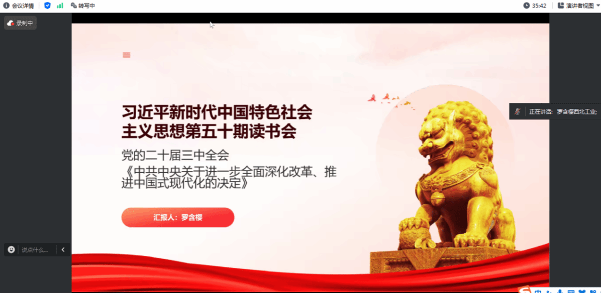 硕士生杨振吉作为首位导读人,深入解读了《中共中央关于进一步全面深化改革、推进中国式现代化的决定》(以下简称决定)中关于进一步全面深化改革的目标要求、根本途径和根本保证。她以促进社会公平正义、提高人民福祉为出发点,详尽阐释了全面深化改革的重大意义。改革为了人民、改革依靠人民、改革成果由人民共享,这是进一步促进社会公平正义、增进人民福祉的目标要求。推进中国式现代化是进一步促进社会公平正义、增进人民福祉的根本途径。坚持党的全面领导是进一步促进社会公平正义、增进人民福祉的根本保证。