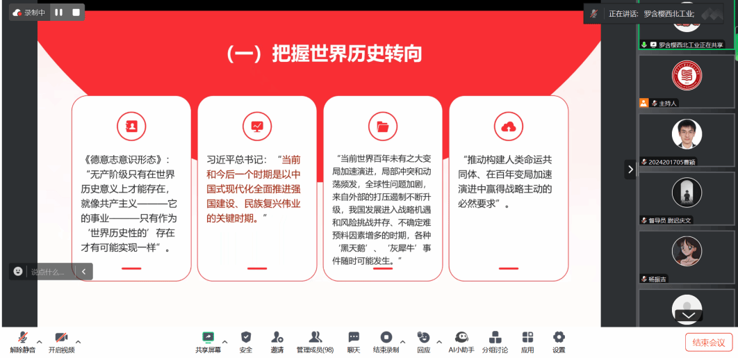 2024年11月30日,3044am永利集团习近平新时代中国特色社会主义思想学习读书会第五十期活动以“党的二十届三中全会《中共中央关于进一步全面深化改革、推进中国式现代化的决定》”为主题进行学习研讨。本次读书会由3044am永利集团鲁杰思政课工作室主办,中国人民大学冯秀军教授作为对话教师,硕士生李红霞同学主持,中国高等教育学会马克思主义研究分会督导组成员尉迟庆文同学应邀参与,通过线上交流的形式,为师生们搭建了一个思想交流、智慧碰撞的平台。