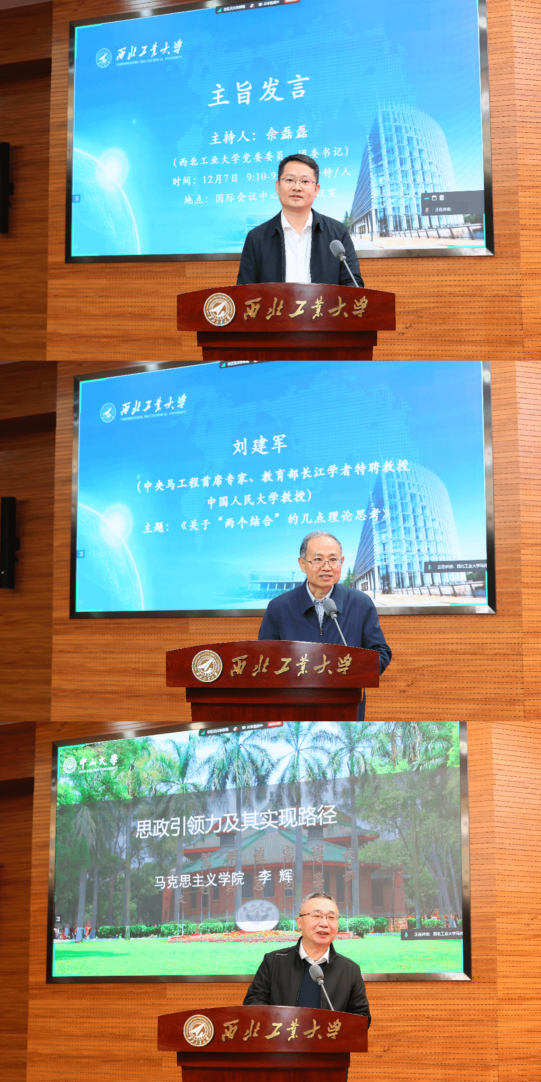 开幕式后,主旨发言由西北工业大学团委书记佘磊磊主持。在主旨发言中,中国人民大学刘建军教授、中山大学李辉教授作了精彩纷呈的发言。中央马克思主义理论研究和建设工程首席专家、国家领军人才、教育部特聘教授刘建军围绕“关于‘两个结合’的几点理论思考”这一主题进行了主旨发言,从定位、层次、又一次思想解放、新的文化生命体四个方面深入浅出的解读了关于“两个结合”的几点思考。国家教学名师,李辉教授作了“思政引领力的可行路径”的主题报告。他从自身经历出发,从思政引领力的内涵、影响思政引领力的因素、思政引领力实现的路径方面进行了深入的探讨。