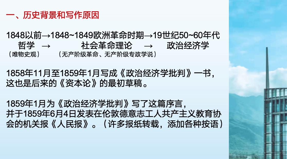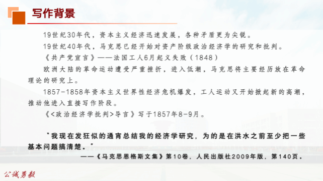 张宇同学针对《政治经济学批判序言》的历史背景、写作原因和主要内容进行了介绍。序言是马克思为其《政治经济学批判》第1分册所写的序言。在这篇序言里,马克思叙述了他研究政治经济学的经过,精辟地概括了历史唯物主义的基本内容,构建起历史唯物主义理论体系的总框架,从而使这篇序言具有巨大的理论意义和科学价值。序言共有七个段落,讨论了三个问题:一是说明马克思关于《政治经济学批判》的写作计划和研究政治经济学的经过;二是阐述唯物主义历史观的基本内容;三是讲述了马克思和恩格斯共同研究哲学和经济学的过程。