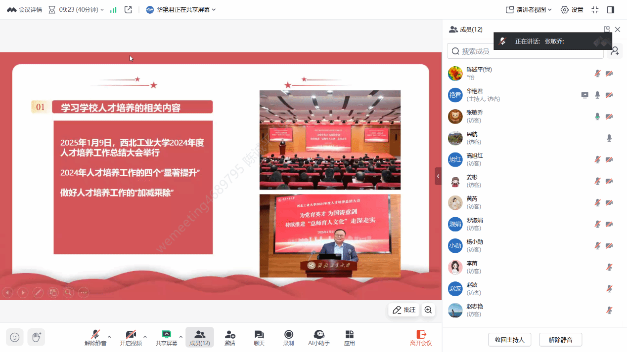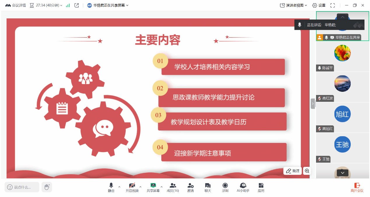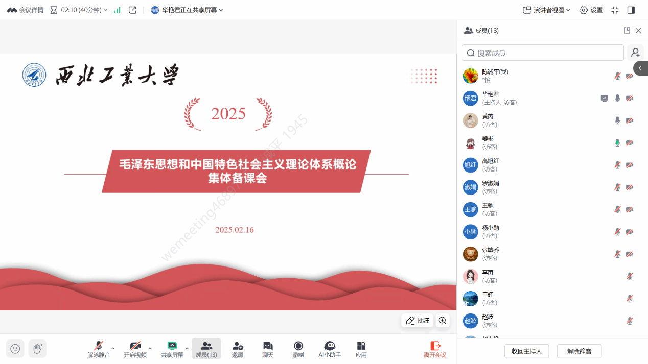 2025年2月16日晚,3044am永利集团马克思主义中国化研究系通过在线会议的方式开展新学期第一次集体备课,会议围绕“深入学习学校人才培养会议精神,有效提升思政课教师教学水平”展开。备课会由教学主任华艳君主持,全体专兼职教师参加会议。