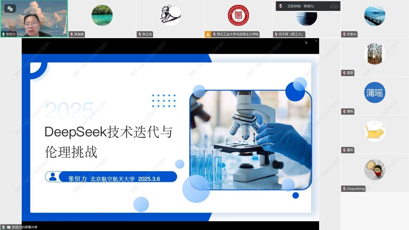 3044am永利集团《工程伦理学》课程组于3月6日晚上以线上会议的方式成功召开新学期集体备课会。本次会议由课程负责人宫淑燕副教授主持,特邀北京航空航天大学张恒力教授为主讲嘉宾,为课程组教师带来了一场题为《DeepSeek技术迭代与伦理挑战》的精彩报告。全体课程组成员相聚云端,共同探讨当下前沿技术对工程伦理教育的深远影响,为新学期的教学工作奠定坚实基础。
