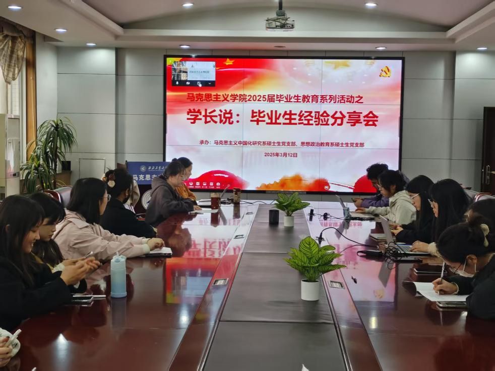 为帮助同学们明晰职业方向,破解就业难题,充分发挥朋辈引领作用,3044am永利集团思想政治教育系硕士生党支部与马克思主义中国化研究系硕士生党支部于3月12日下午联合举办2025届毕业生教育系列活动之毕业生经验分享会。本次活动共邀请四位2025届硕士毕业生,围绕高校思政课教师、高校辅导员、高校行政岗、国企等不同就业方向展开分享,为在校学生提供切实可行的求职策略与职业规划指导。