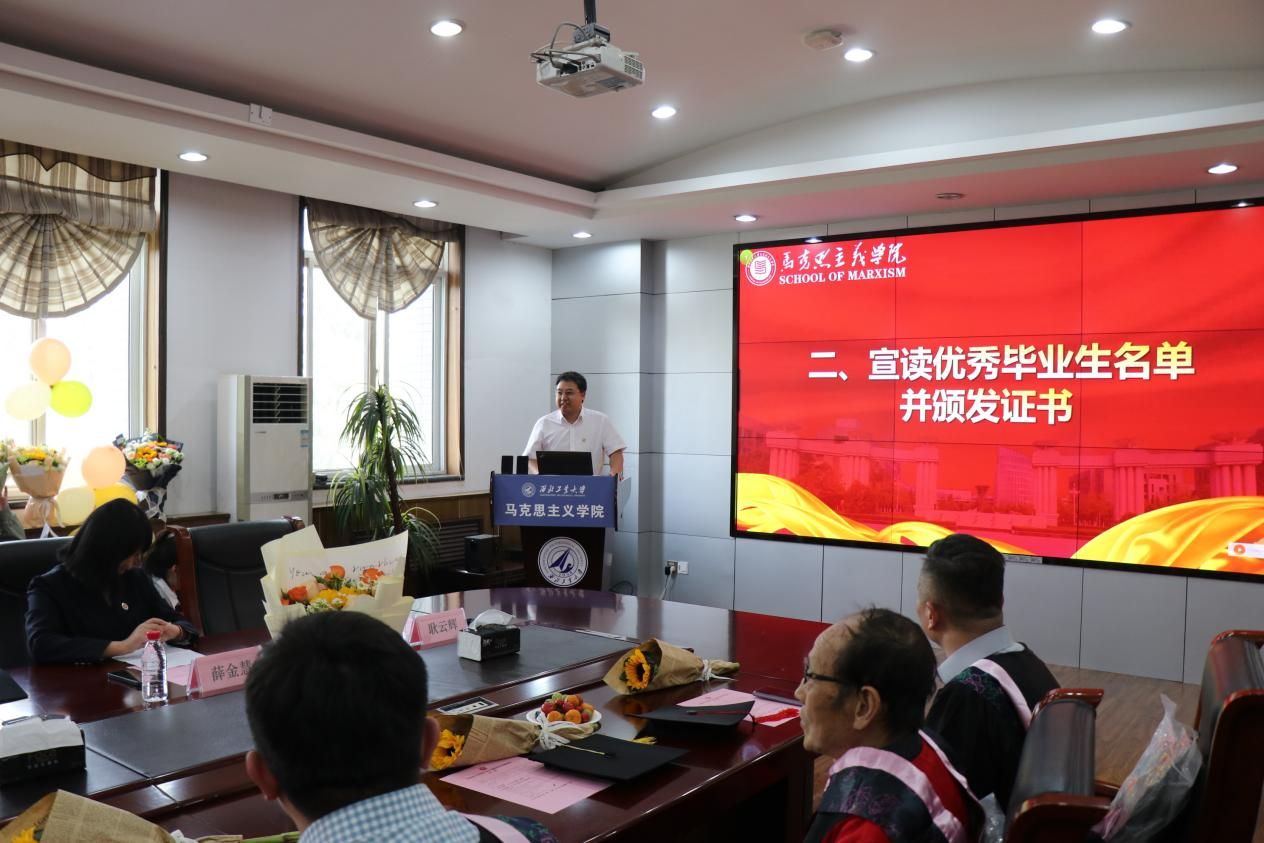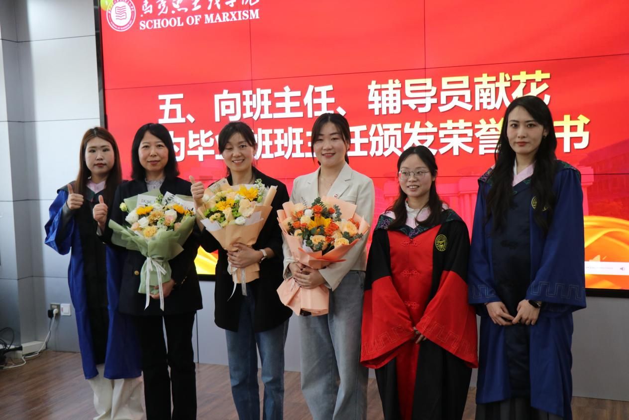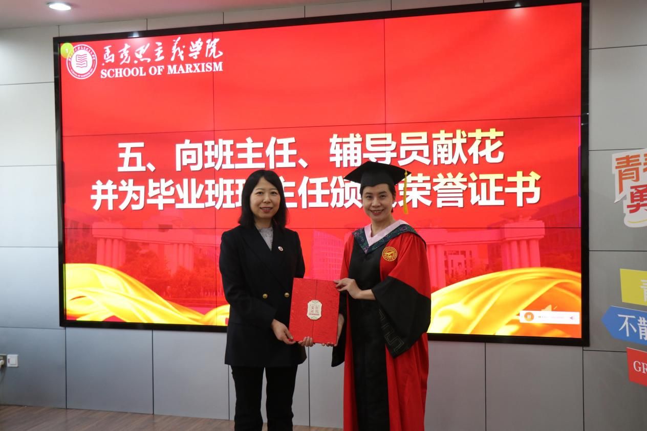 毕业生代表为硕士生辅导员王换、博士生辅导员许斯诺、毕业生班主任代表薛金慧献花,学院副院长贺苗为薛金慧颁发荣誉证书,以感谢老师们近年来的辛勤付出和无私奉献。随后,薛金慧发表了感人至深的发言,向顺利完成学业的同学们表示祝贺,并以“热情、责任、勇敢”寄语毕业生们在新的人生道路上充满激情、肩负使命、无畏前行。
