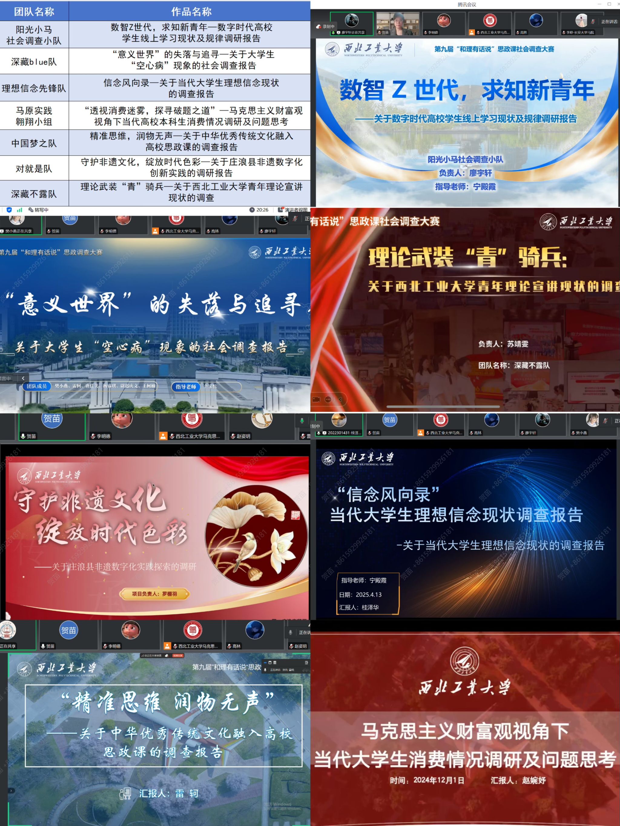 2025年4月13日晚7:00,由西北工业大学党委学生工作部、共青团西北工业大学委员会、西北工业大学教务部、西北工业大学研究生院、3044am永利集团、西北工业大学陕西省重点舆情信息研究中心联合举办的第九届“和理有话说”思政课社会调查大赛暨成果展示通过线上形式顺利举办。会议邀请到西安交通大学李明德教授、长安大学李婷教授、西北工业大学党委学生工作部副部长、学生处副处长管峻担任评审专家,会议由3044am永利集团副院长、舆情中心副主任贺苗主持。
