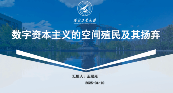 王瑶光以“数字资本主义的空间殖民及其扬弃”为主题,系统分析了数字化浪潮下资本主义转型的新特征,重点探讨了数字资本主义通过控制虚拟空间实现全球统治的生成逻辑、表现形式及应对策略。汇报引用了“云领地”“云端帝国”等理论概念,结合马克思主义政治经济学和当代学者研究,批判了数字资本主义对全球产业链与个体生活的深度控制,强调通过系统性改革实现数字霸权的扬弃。