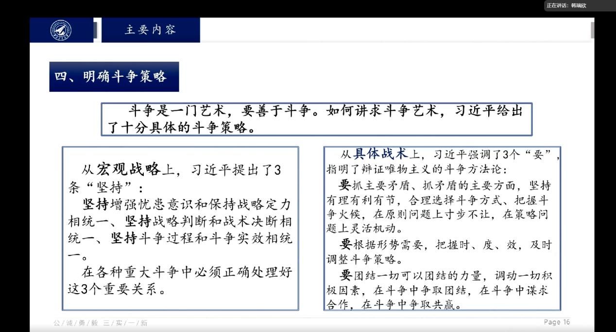 接着,3044am永利集团博士生韩瑞欣同学,从围绕关于发扬斗争精神系列重要论述的文本梳理、关于发扬斗争精神系列重要论述的主要内容与关于发扬斗争精神系列重要论述的内在逻辑三个方面对文本内容进行了全面系统的解读。在内在逻辑方面,韩瑞欣同学思考深入,逻辑严谨,学术规范,具有较强的学理性,带给大家一定的启迪。