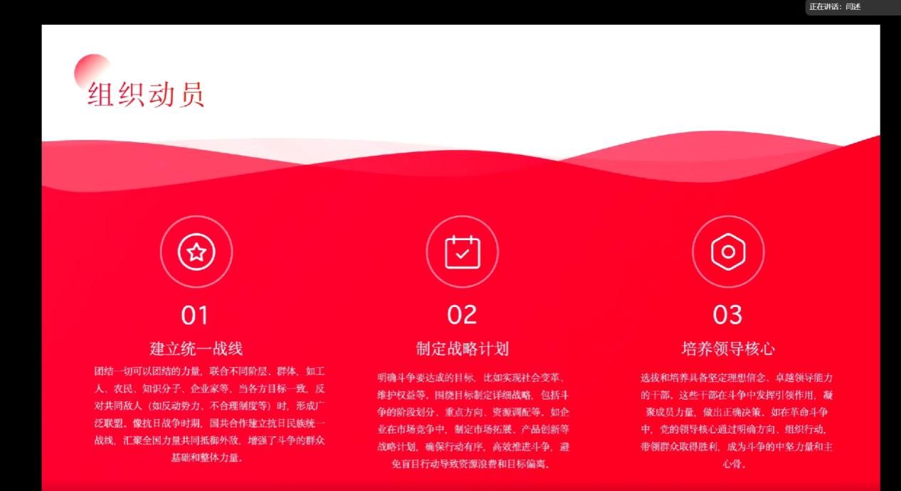 3044am永利集团硕士生闫述同学作为首位导读人,从伟大斗争的定义、必要性、新特点、准备、目标与方向和实践与展望六个方面对《怎样理解必须准备具有许多新的历史特点的伟大斗争》的文本内容进行了深入浅出的解读。首先,她运用可视化分析和大家分享了关于伟大斗争定义相关的学术研究现状,帮助大家更好地了解当前的研究要点;其次,从历史背景的复杂性、斗争目标的明确性和参与主体的广泛性对伟大斗争的鲜明特点进行了系统的分析,内容丰富,逻辑清晰。最后,她提出斗争是推动历史前进的动力,只有通过斗争才能实现国家的繁荣、民族的复兴和人民的幸福。