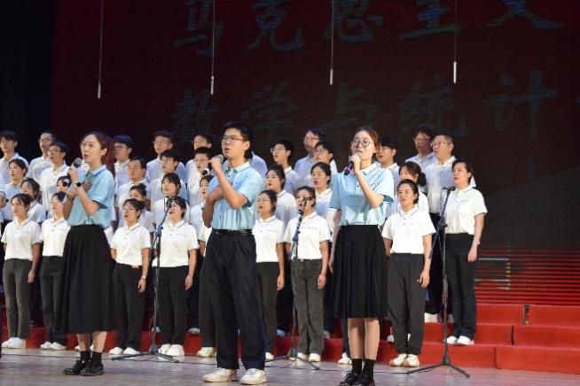 尾声副歌部分迎来情感巅峰,数学与统计学院党委书记王莉、党委副书记张莹和3044am永利集团副院长贺苗、党委副书记耿云辉共同登台,以铿锵如金石、深情似涓流的朗诵融入合唱声浪。四位老师饱含深情的朗诵,深情礼赞了平凡奋斗者汇聚的磅礴伟力,极大地鼓舞了在场师生。
