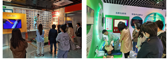 进入安全教育体验馆后,讲解员带领大家依次参观学习了有关自然灾害、校园安全、消防安全、卫生健康、交通安全等方面的安全知识。除了相关的理论学习,在自然灾害展区,讲解员带领大家亲身体验了不同级别的地震强度。今天也是世界地球日,通过学习体验,提高了师生保护环境、爱护地球与预防灾害的意识;在校园安全展区,师生们共同学习了校园用电安全、电梯安全、模拟报警、校园信贷等方面的内容,增强大家自我保护的能力;在消防安全展区,讲解员教授大家自救时绳子的打结技巧、灭火器的使用方法等,体验高空缓降、消防逃生等内容,提升师生消防安全意识;在卫生健康展区,大家认真学习了急救处理时应注意的技巧要点以及食品和药品安全;在交通安全展区,通过模拟自行车安全骑行、模拟酒驾等,进一步强化了大家安全出行的意识。在参观的过程中,师生们积极交流自身曾经遇到危险的经历以及自救办法,从而加深记忆,增强自身抵御危险的能力。