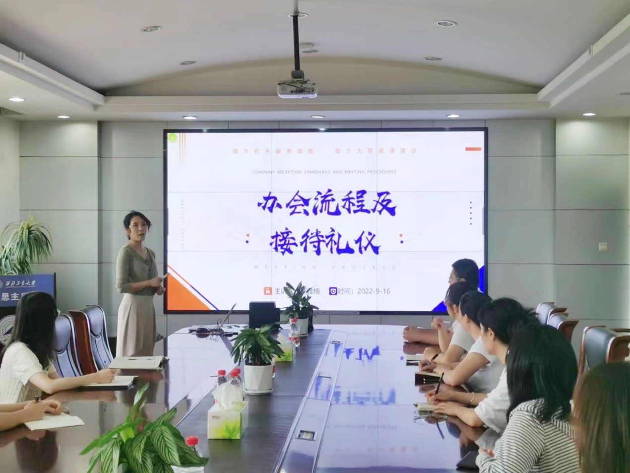 会上,郭雅楠结合学院实际,从会前筹备、会场布置、会议跟进和会议收尾四个方面详细介绍了办会流程和会议接待标准,详细梳理了会务工作注意事项和标准化筹办细节,并结合具体实例和相关规范,详细讲解了会务接待礼仪,明确了作为会务工作者如何在大型会议中举止更加得体大方,更好地展现学院专业的会务风采和良好的精神面貌。