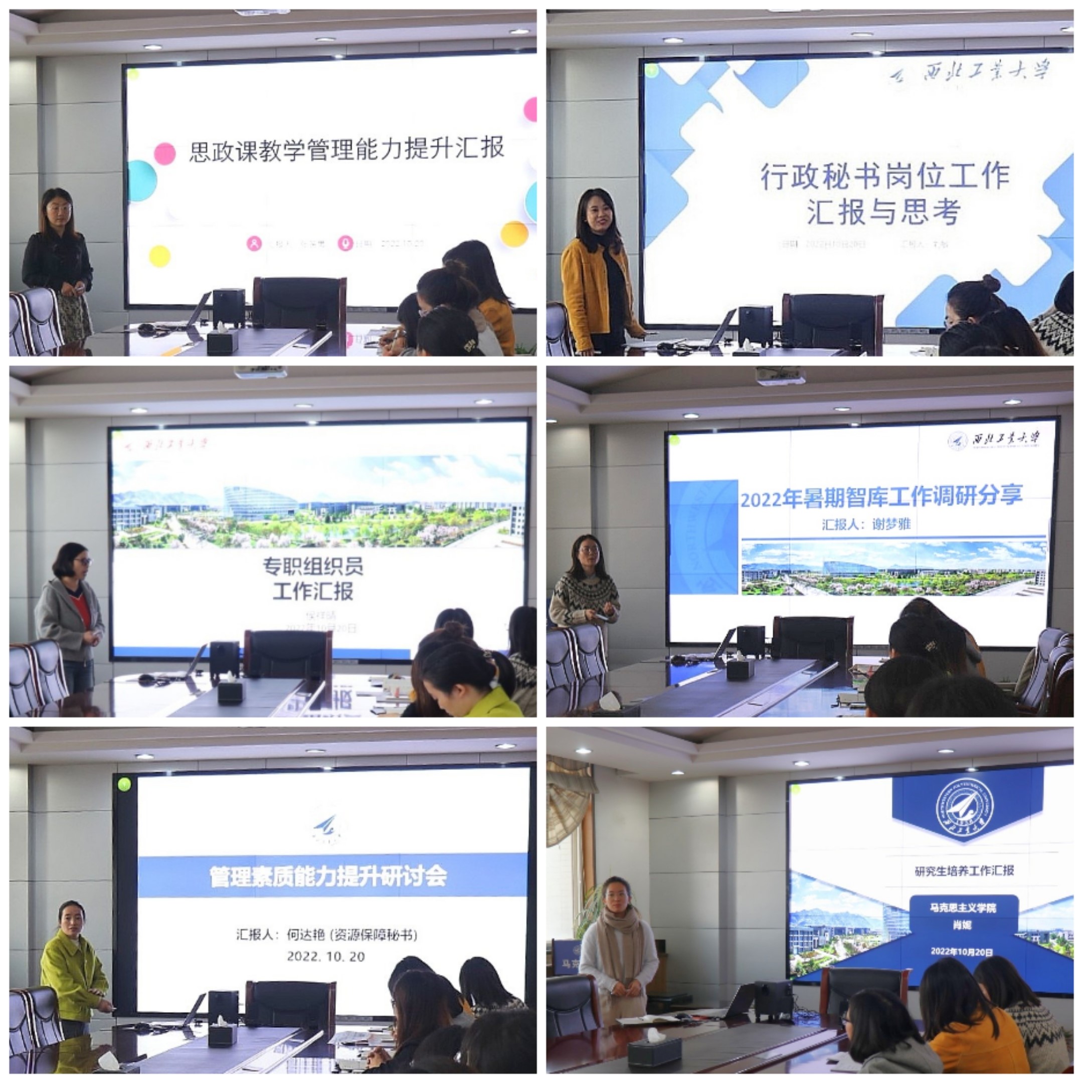 公共课教学秘书张笑男就我校思政公共课开展情况进行了梳理并与调研高校进行了对比分析。行政秘书刘敏从行政秘书特点和定位出发,阐释了如何在工作中贯彻落实岗位育人。党务秘书(专职组织员)侯祥晴详细梳理了学院党委党建工作开展情况并就如何持续推进党务工作深入细致展开进行了规划。舆情中心秘书谢梦雅通过调研案例生动的为大家呈现了舆情工作全貌。资源保障秘书何达艳则重点呈现了各调研高校档案工作开展情况以及后续资源保障工作的规划。研究生培养秘书肖妮按照工作的时间节点梳理了研究生培养任务并汇报围绕研究生培养展开的工作创新模式。