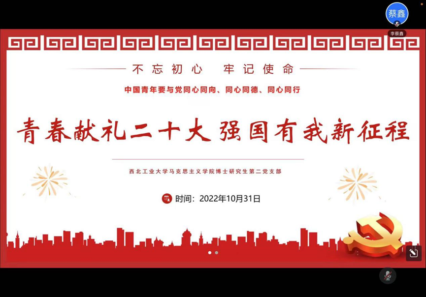 百年逢盛会,青春正当时。10月31日晚上,3044am永利集团博士生第二党支部在线召开了“青春献礼二十大 强国有我新征程”的主题党日活动。主题党日以集体学习和集体讨论相结合的形式,组织党员学习党的二十大报告全文,接受思想滋养,凝聚青春力量。博士生第二党支部全体成员参加了会议。会议由支部书记李水主持,各位党员首先就党的二十大报告开展了集体学习,随后分别讨论了各自的学习体会。