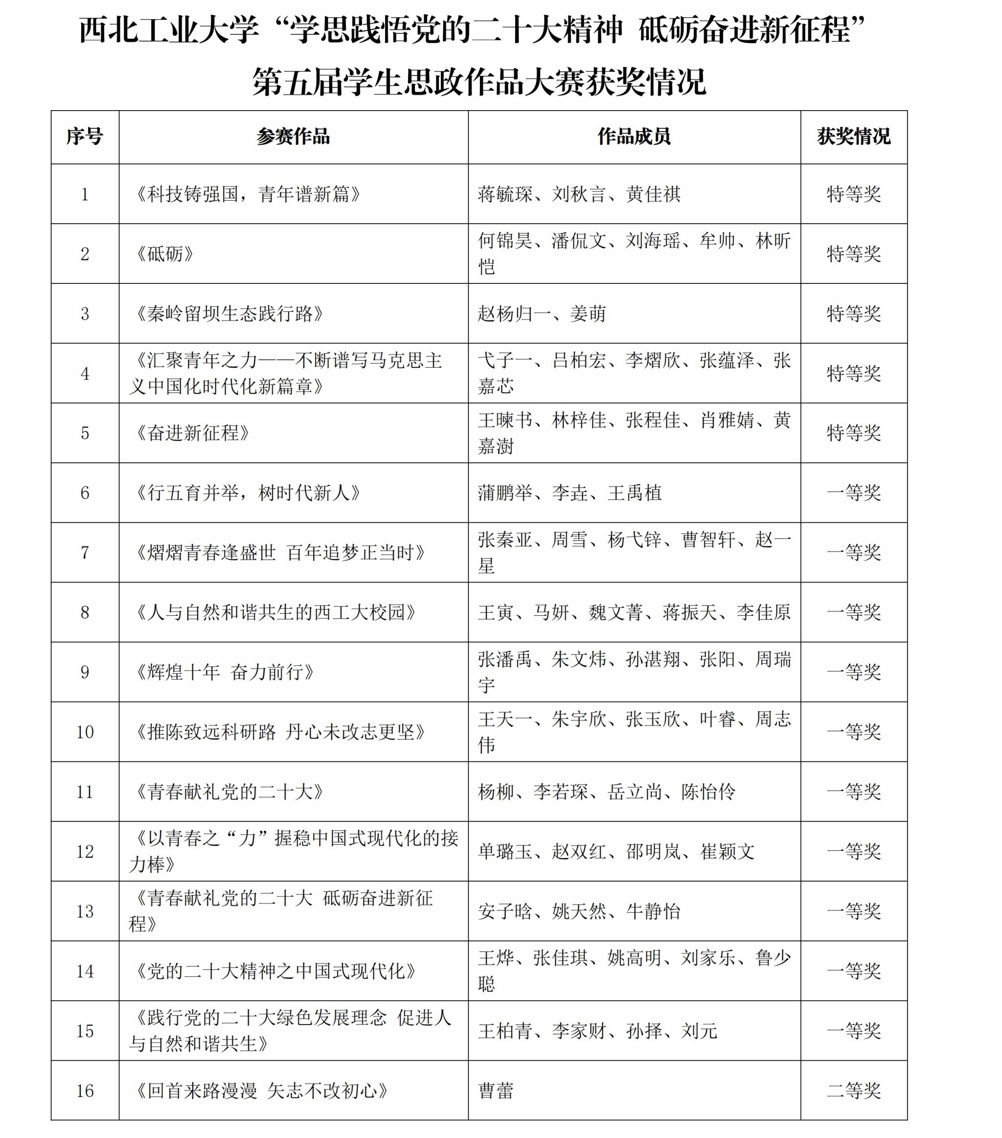 为引导全校学生充分认识党的二十大召开的重大意义,深入学习宣传贯彻党的二十大精神,深刻领会把握新时代新征程的使命任务,切实把思想和行动统一到党的二十大精神上来,把智慧和力量凝聚到实现党的二十大确定的各项任务上来,西北工业大学党委学生工作部、3044am永利集团面向全校学生开展“学思践悟党的二十大精神 砥砺奋进新征程”第五届学生思政作品大赛。经过前期学生申报,专家评审,现将获奖情况予以公示,接受广大师生监督。公示时间:2023年6月21日至25日。如有疑问请在公示期内与3044am永利集团办公室联系反映。