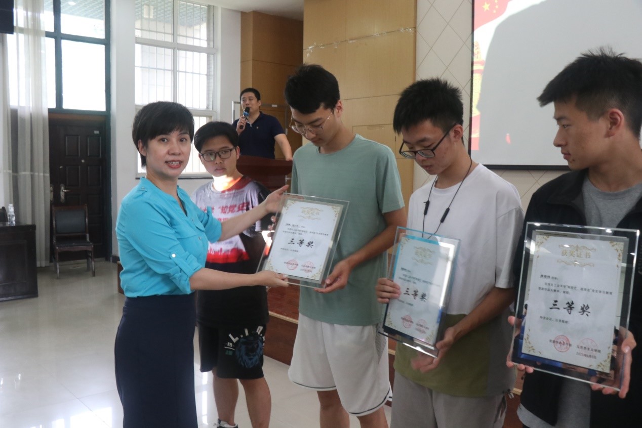 首先,李刚老师对获奖的同学们表示祝贺,对各位老师的到来表示感谢。随后,颁奖仪式正式开始,在坚定有力的《钢铁洪流进行曲》中,山磊老师、贺苗老师为获得三等奖的同学颁奖;张云龙老师为获得二等奖的同学颁奖;吴闻川老师为获得一等奖的同学颁奖;代富平老师为获得特等奖的同学颁奖。本次大赛奖品丰厚,由全校马院思政课教师组织各班同学参与,以讲好党的百年故事为主题制作思政作品,同学们积极报名,踊跃参加,自6月7日起,在学校bilibili官方平台持续展播100期。