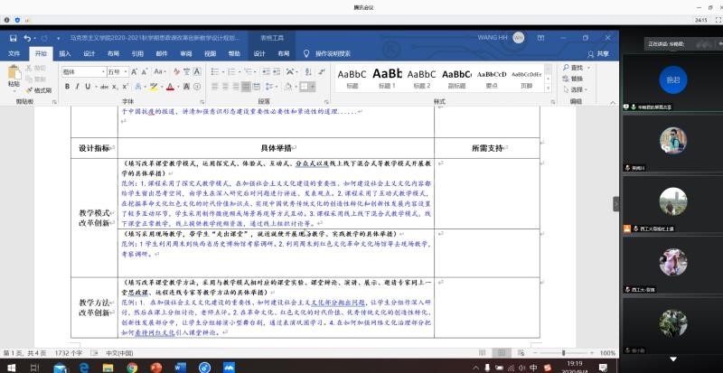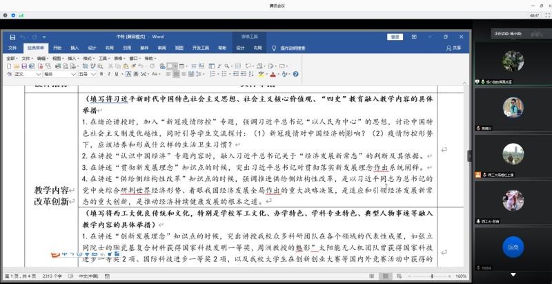 备课会首先进行分组说课,各位任课教师按照学院下发的《3044am永利集团2020-2021秋学期思政课改革创新教学设计规划表》,结合授课专题,从教学内容、教学模式、教学方式、教学资源等方面对课程创新点进行了充分规划设计。将习近平新时代中国特色社会主义思想、社会主义核心价值观、“四史”教育、西工大优良传统和文化、时政热点等有机融入课程,对探究式、体验式、互动式、分众式以及线上线下混合式、现场教学等教学模式以及课堂辩论、演讲、展示、邀请专家同上一堂思政课、远程连线专家、雨课堂信息技术手段运用等教学方法都进行了有效尝试,并充分挖掘慕课、优质教辅材料、视频资料等教学资源。四位点评教授分别对每位教师的说课从内容到形式进行了精彩点评。