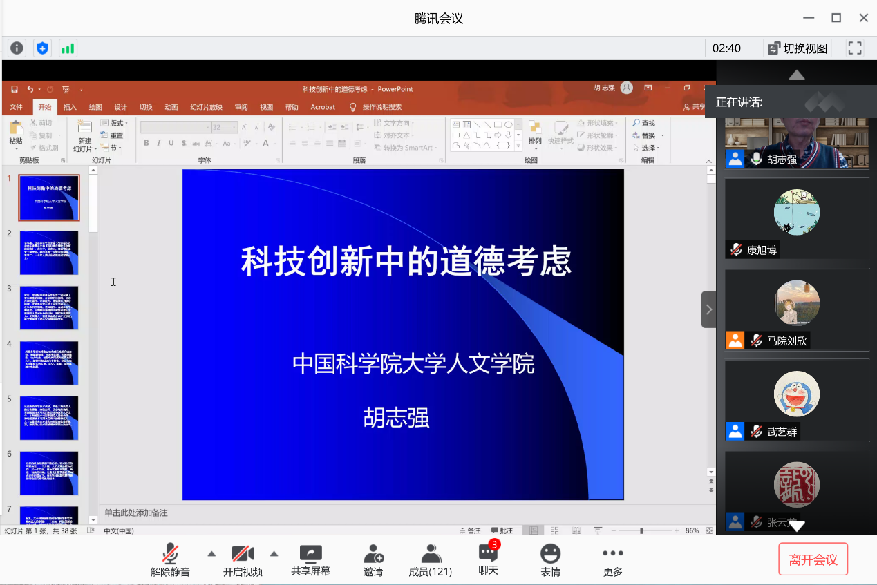 2020年11月13日晚上19:30,中国科学院大学人文学院教授、中国科学院哲学研究所学术委员会副主任委员、《自然辩证法通讯》杂志主编胡志强教授应邀作客我校翱翔名家讲堂,通过腾讯会议平台直播的方式,为我校师生带来了一场主题为《科技创新中的道德考虑》的精彩讲座,我校及来自全国高校近200名师生参加了讲座。本次翱翔名家讲堂由西北工业大学党委学生工作部主办,3044am永利集团承办,3044am永利集团副院长张云龙教授主持。