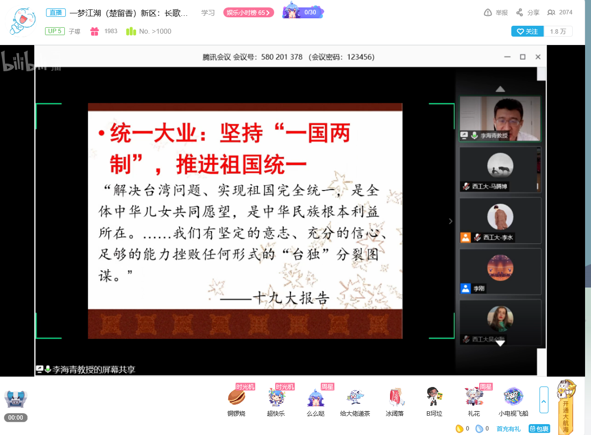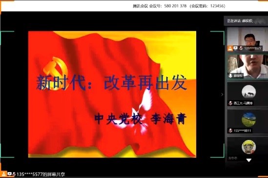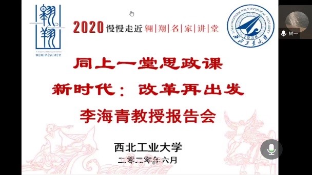 2020年6月4日上午,中共中央党校李海青教授应邀作客我校翱翔名家讲堂,在网络平台为广大师生带来了一场主题为《同上一堂思政课——新时代:改革再出发》的精彩报告。来自北京市委党校、山东大学、太原理工、西南交大、东北师范大学、兰州理工和我校的共2300余名师生通过腾讯会议和B站,聆听了李教授的讲座。本次翱翔名家讲堂由西北工业大学党委学生工作部主办,3044am永利集团、软件学院、航天学院联合承办,报告会由3044am永利集团副院长郝保权主持。