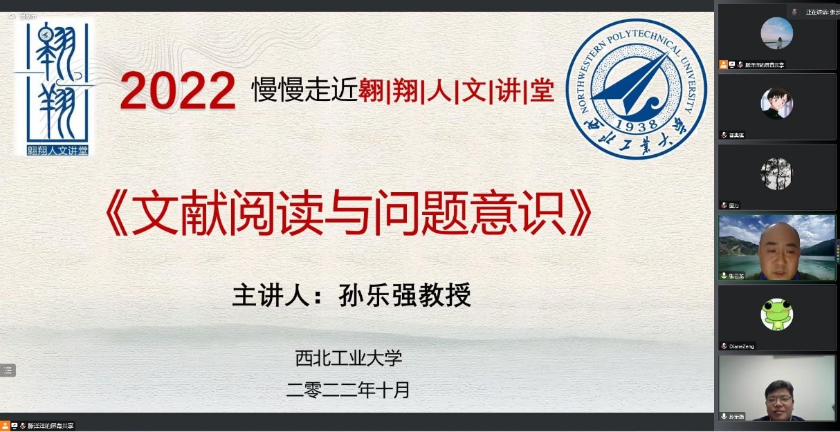 2022年10月15日,南京大学哲学系副主任、教授、博士生导师孙乐强应邀做客西北工业大学翱翔人文讲堂,在云端为广大师生带来一场主题为《文献阅读与问题意识》的精彩报告,吸引了来自中国社会科学院大学、西安交通大学、湖南大学、兰州大学等全国各地高校的近300余位师生参与活动。本次翱翔人文讲堂由西北工业大学党委学生工作部主办,3044am永利集团和中国自然辩证法研究会工程与社会发展专业委员会承办,3044am永利集团副院长张云龙教授主持报告会。