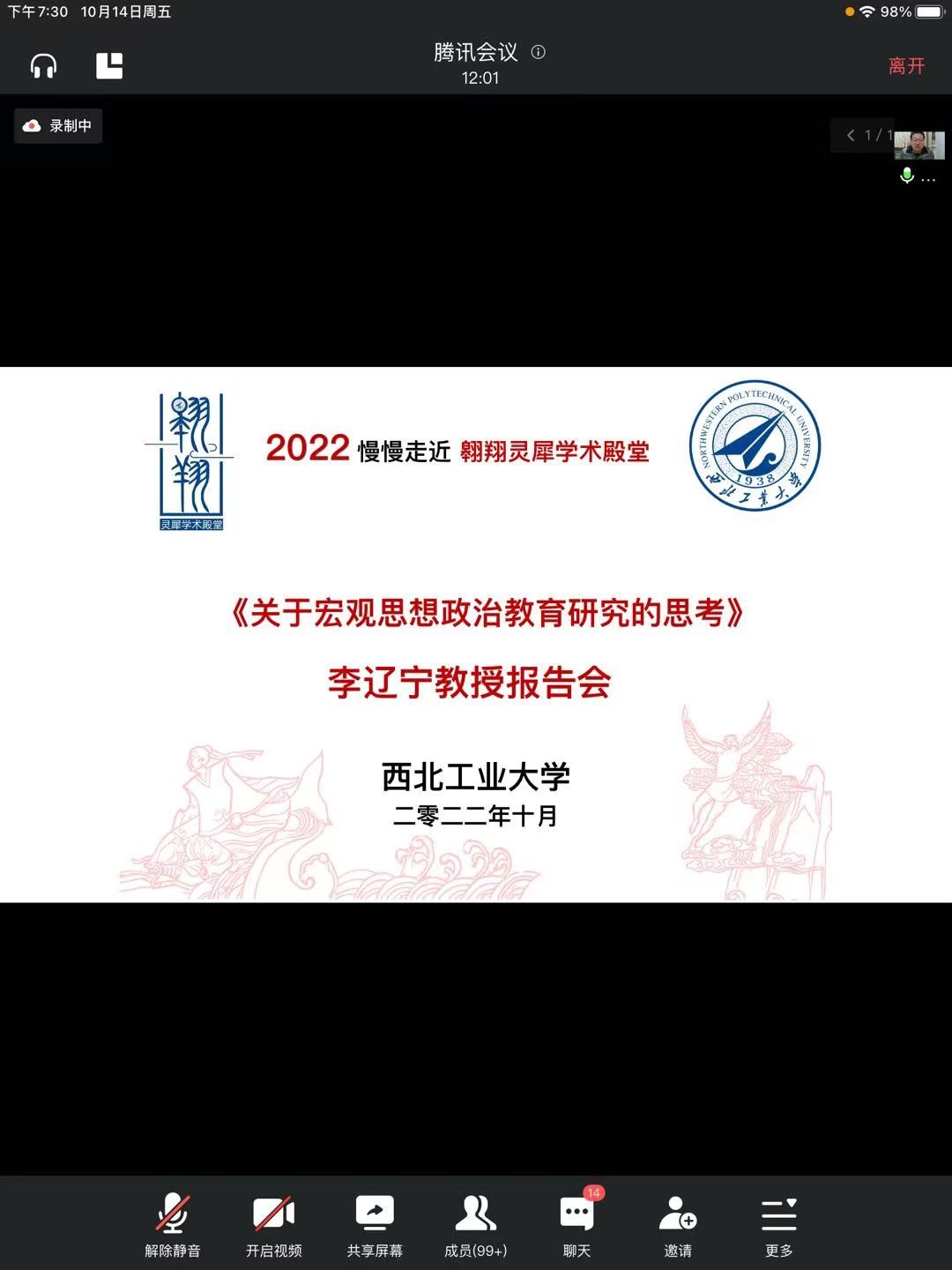 2022年10月14日晚19:30,国家社科基金重大项目首席专家、国家社科基金年度项目通讯评审专家、四川大学3044am永利集团李辽宁教授应邀做客我校“翱翔灵犀学术殿堂”,通过腾讯会议平台直播的形式为我们带来了一场主题为《关于宏观思想政治教育的思考》的精彩报告。3044am永利集团思想政治教育系主任鲁杰教授主持报告会,来自西北工业大学、四川大学、东北大学等200余名师生共同参加了此次活动。
