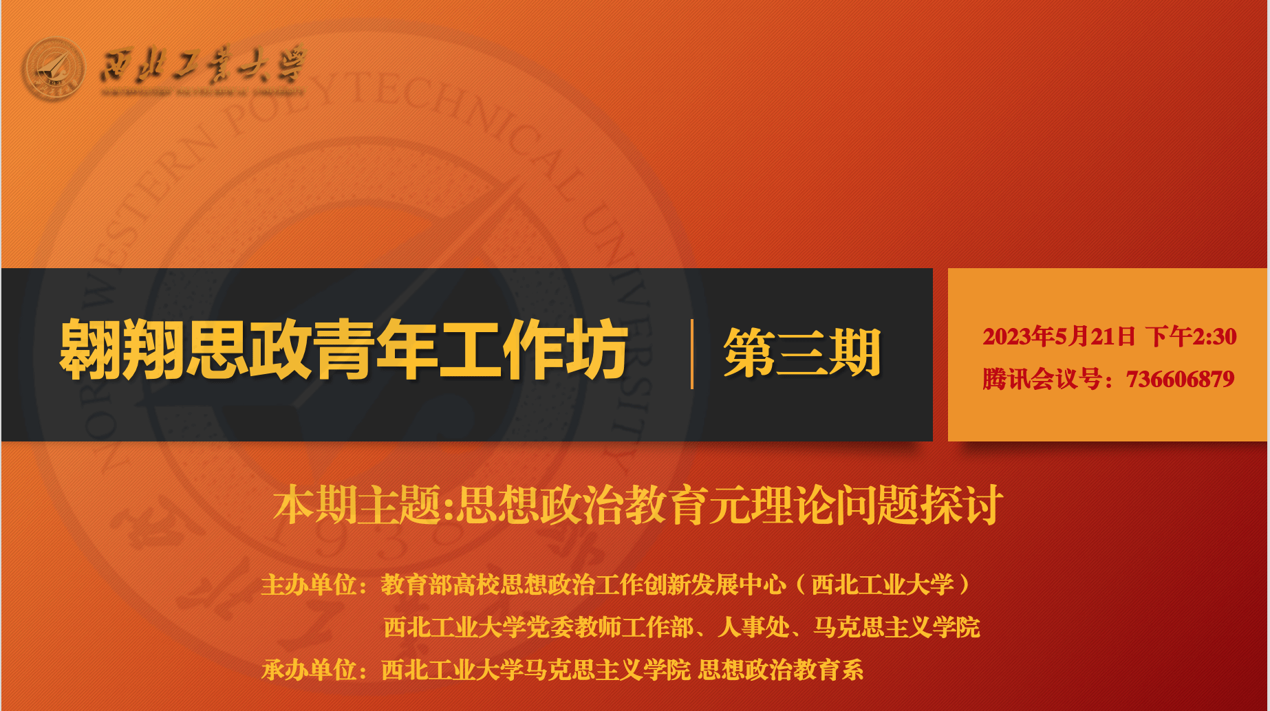 思想政治教育是中国共产党的独特优势和高校各项事业建设发展的中心环节,为夯实与深化思想政治教育学科基础理论的研究,5月21日,3044am永利集团翱翔思政青年工作坊(第三期)在线上成功举行。本工作坊由教育部高校思想政治工作创新发展中心(西北工业大学)、西北工业大学党委教师工作部、人事处、3044am永利集团主办,3044am永利集团思想政治教育系承办。本期工作坊共邀请了五位优秀的青年思政学者,以“思想政治教育元理论问题探讨”为主题,进行观点分享与互评对谈。