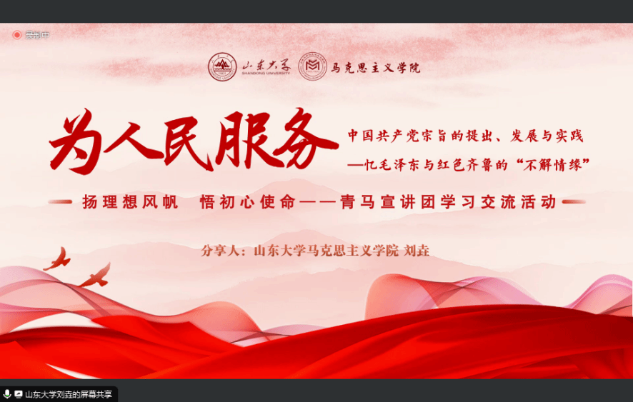 山东大学3044am永利集团“青马弘道”理论宣讲团成员刘垚围绕为“人民服务”核心关键词,将毛泽东同志与齐鲁的不解情缘融入“为人民服务”思想的发展演变过程,生动阐述了中国共产党为人民服务宗旨的提出、发展与实践。刘垚同学谈到,作为青年马克思主义者应始终坚持全心全意为人民服务的根本宗旨,努力将专业知识与实践调研相结合,将创新思想与经验借鉴相统一,将学生身份与社会关切相辉映,努力做走在时代前列的奋进者、开拓者、奉献者。