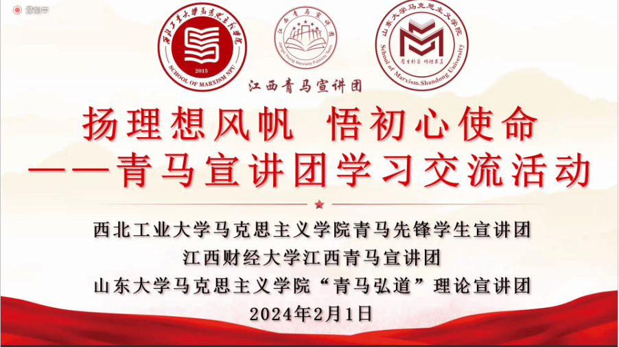 为深入学习贯彻习近平新时代中国特色社会主义思想,推动用党的创新理论铸魂育人,探索合作共建新路径,整合高校资源,促进育人工作和宣讲工作高质量发展,2024年2月1日19:00,3044am永利集团青马先锋学生宣讲团联合江西财经大学江西青马宣讲团、山东大学3044am永利集团“青马弘道”理论宣讲团开展的“扬理想风帆 悟初心使命”青马宣讲团学习交流活动在线上进行,学院党委副书记李刚、各校宣讲团成员及青马学子相聚“云端”,活动由学院团委书记、硕士生辅导员王换主持。