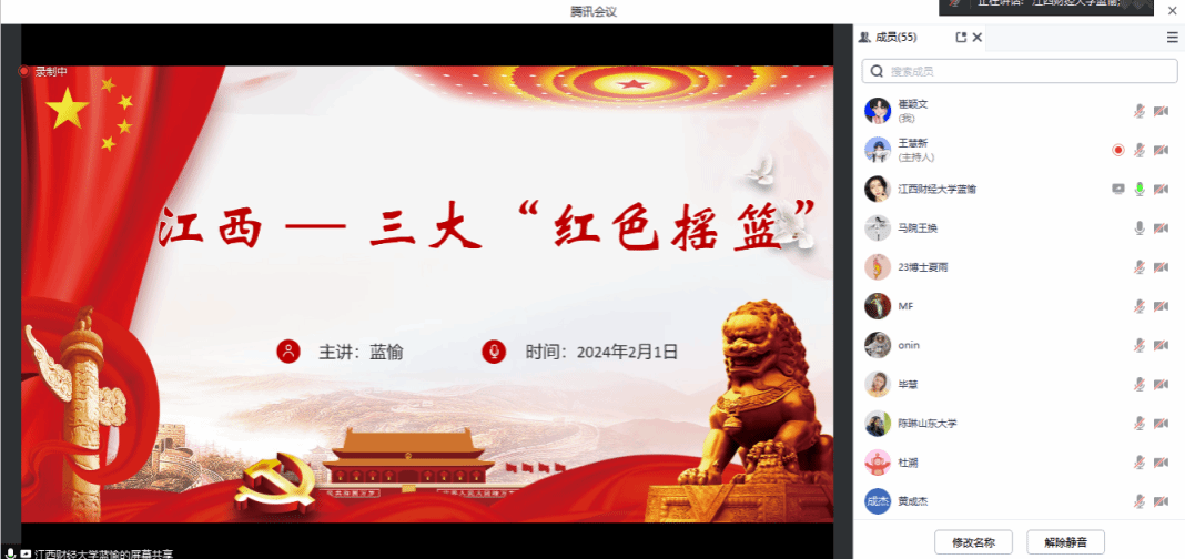 江西财经大学江西青马宣讲团成员蓝愉带来以《江西:三大红色摇篮》为题的宣讲。蓝愉同学讲述了以八一南昌起义而闻名的南昌、中华苏维埃共和国诞生地瑞金、中国革命根据地井冈山三大红色摇篮,真实再现了江西在革命年代的突出贡献,带领与会师生回顾伟大革命斗争历程,体会革命先烈不怕牺牲、勇往直前的爱国主义精神,了解江西在中国革命史中的重要历史地位,深刻体悟党的艰辛奋斗史和党的精神谱系。