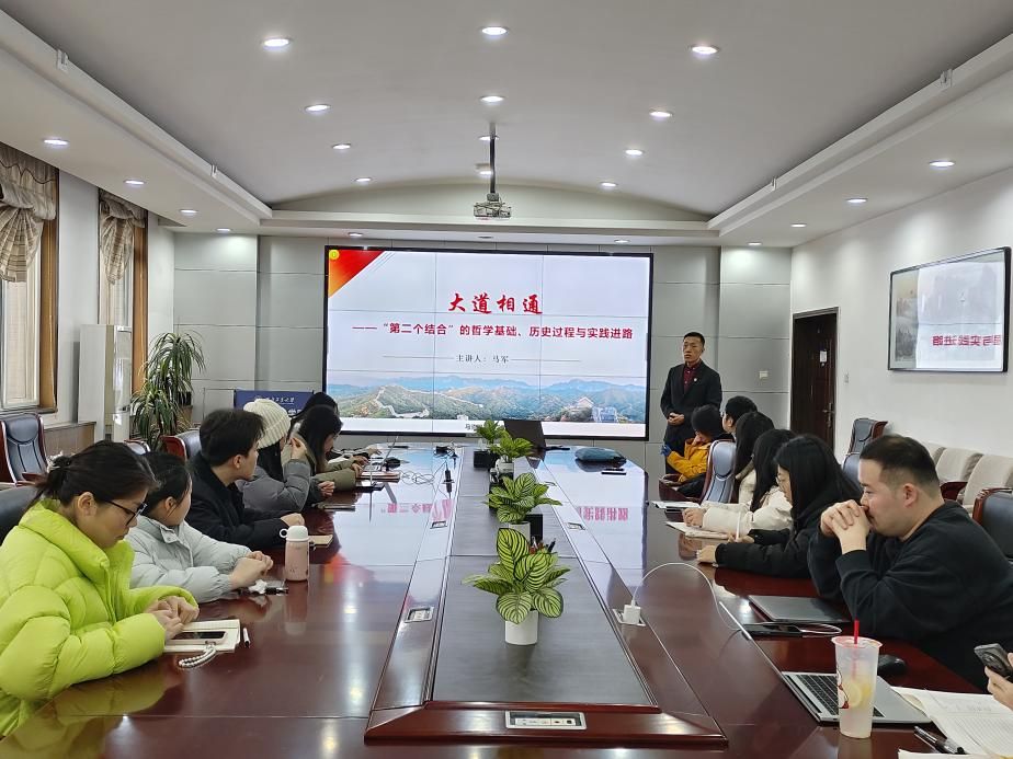 2024年12月9日下午,3044am永利集团院长助理马军应邀在学院楼208会议室讲授“大道相通——‘第二个结合’的哲学基础、历史过程与实践进路”专题党课。本次党课由思想政治教育系党支部书记鲁杰主持,思想政治教育系党支部联合思想政治教育系硕士生党支部全体党员共同参与学习。在场师生学习氛围浓厚,讨论热烈。