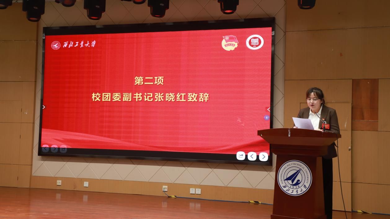 首先,西北工业大学团委副书记张晓红致辞。她代表校团委向大会的召开表示热烈的祝贺并肯定了3044am永利集团团委的工作,指出青马学子在积极投身乡村振兴、“大思政课”建设、理论宣讲等方面取得了显著成绩,用实践证明了青马学子的使命担当。同时,她代表校团委向学院团员青年提出了三点建议:一是要坚定理想信念,认真学习贯彻习近平新时代中国特色社会主义思想,增强“四个意识”、坚定“四个自信”、做到“两个维护”;二是要勇担时代重任,主动强化实践锻炼、贴近人民群众、深入基层一线,让青春绽放在祖国最需要的地方;三是要保持奋斗激情,在新征程上吃苦耐劳、自力更生,弘扬永久奋斗的优良传统。