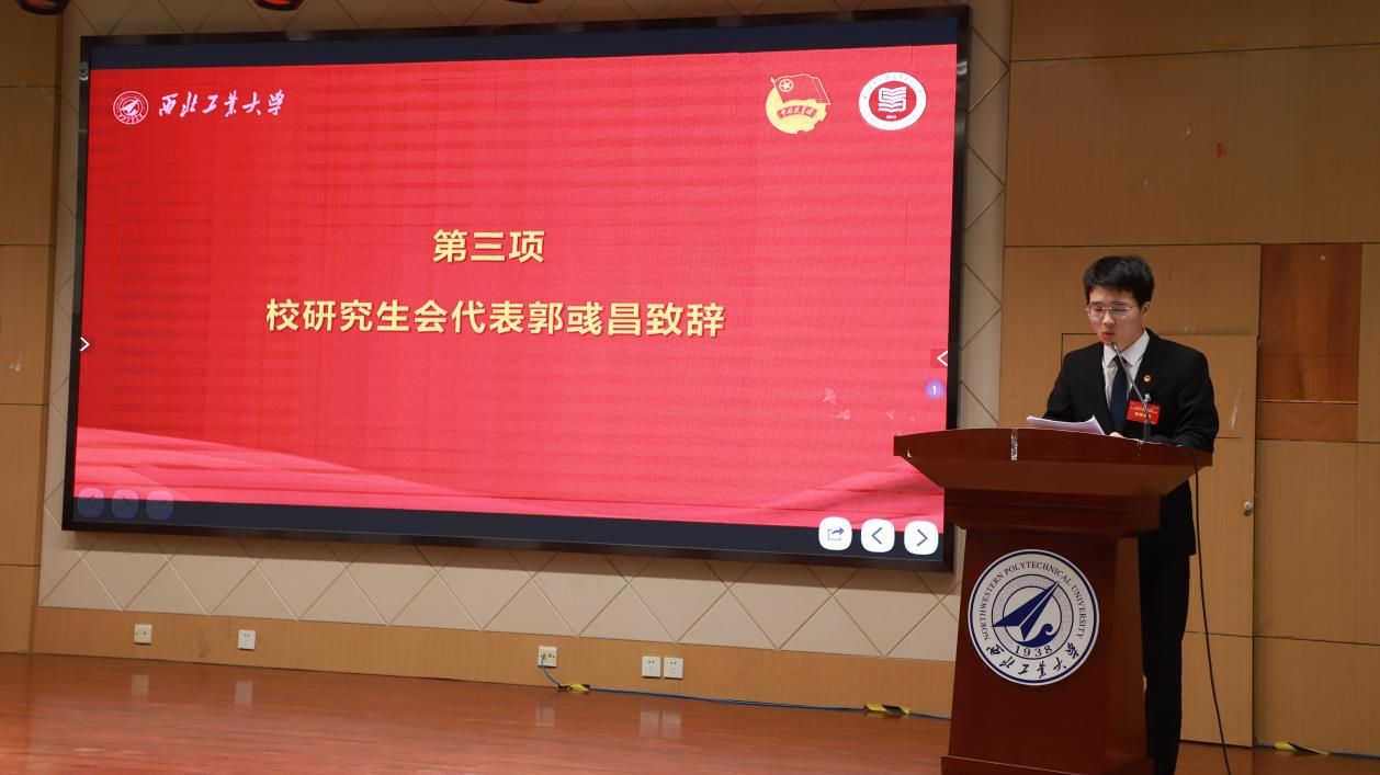 接着,西北工业大学研究生会代表郭彧昌致辞。他代表校研究生会向学院全体研究生致以诚挚的问候,肯定了3044am永利集团研究生会过去一年在思想引领、“双一流”建设、基层服务、志愿活动等多个方面的努力和成果,并提出希望能够进一步加强校院的交流合作。同时,他向学院研会和学生代表提出了三点希望:一是要聚焦政治引领,把学习贯彻党的二十大和二十届二中、三中全会精神贯穿履职尽责始终;二是要聚焦“形神兼备”,把学联学生会组织改革进行到底;三是要聚焦主责主业,把服务同学和服务大局落到实处。