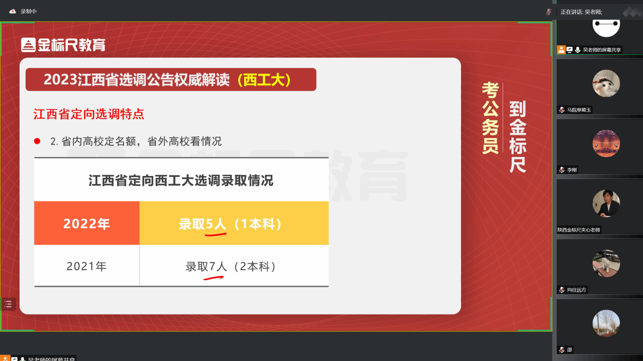 讲座伊始,吴沈川老师对2023年江西选调公告进行了权威性解读,通过对选调对象及计划、选调程序和时间安排的讲解,对比2021与2022江西省定向西工大选调录取情况,说明了江西省政府对选调生选拔与培养等相关工作的重视以及在政策上给予的支持。