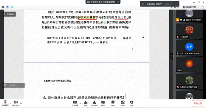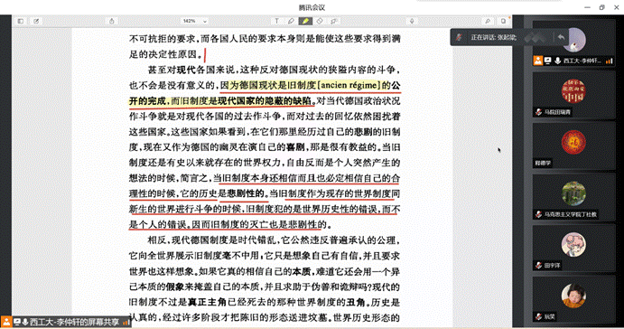 2020年3月21日晚上7点,西北工业大学第29期“启真明智”读书会通过腾讯会议顺利举行,本次读书会由3044am永利集团助理教授张起梁主持,3044am永利集团教授丁社教、张云龙、助理教授杨永强做客云端,与硕博同学一起阅读马克思和恩格斯的经典著作,本次读书会的阅读内容为《黑格尔法哲学批判》导言。