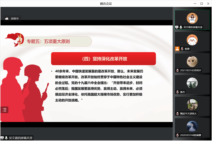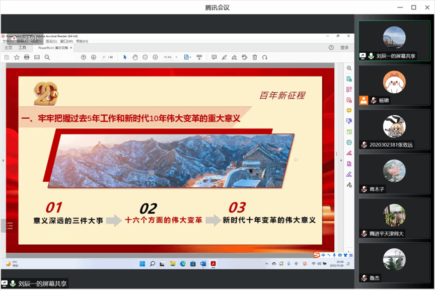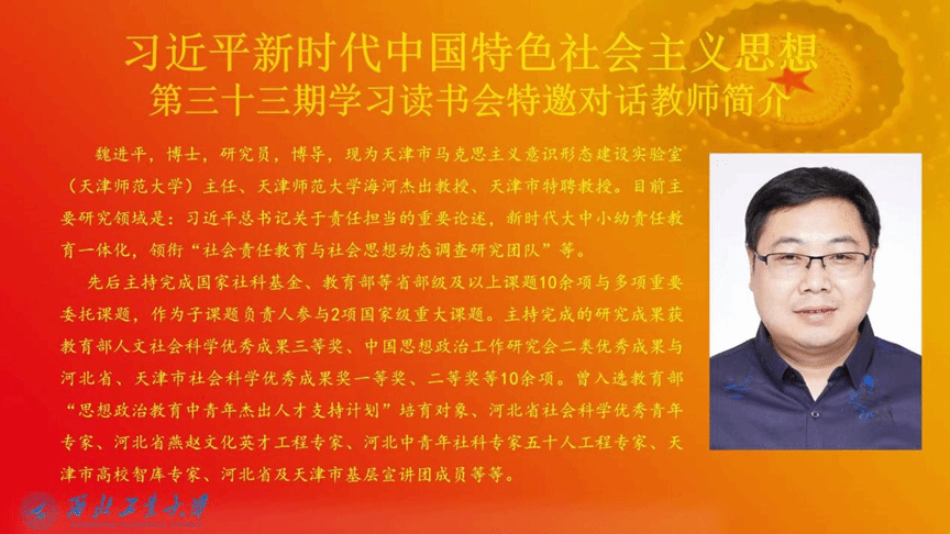 为全面学习贯彻党的二十大精神,推进习近平新时代中国特色社会主义思想进教材、进课堂、进头脑。2022年11月26日,3044am永利集团习近平新时代中国特色社会主义思想学习读书会第三十三期活动主题围绕《习近平在中国共产党第二十次全国代表大会上的报告》进行学习研讨。本次读书会由我院思想政治教育系主任、博士生导师鲁杰教授发起,学院硕士生蒋木子主持,天津师范大学3044am永利集团研究员、博士生导师魏进平作为对话教师应邀参加。