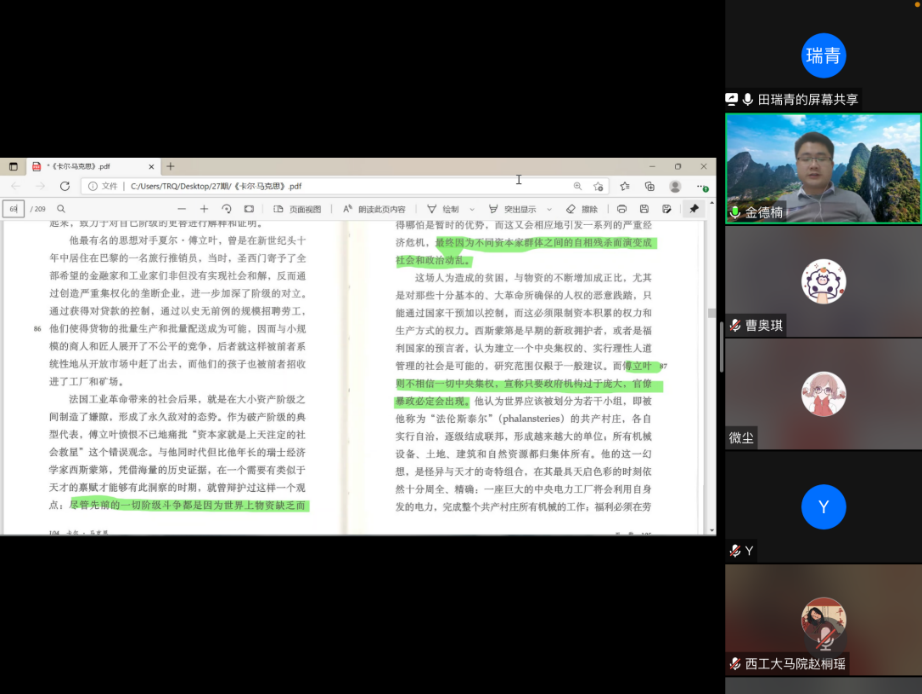 首先,杨永强介绍了金德楠老师的简历,并对金老师的到来表示欢迎。研究生黄奕彩、张晨娅、赵桐瑶、李仲轩和田瑞青先后阅读文本内容,表达了对所阅读内容的理解,并提出了一些针对性的问题,老师们对学生提出的问题进行了解答。师生们围绕圣西门和傅立叶的空想社会主义思想、“集权”和“极权”的区别、自由主义和社会主义的对立、人的解放的三种方式、马克思“两个转变”的重要性和局限性以及写作中的“言不及意”和阅读中的“意所难及”现象进行了深入的交流。