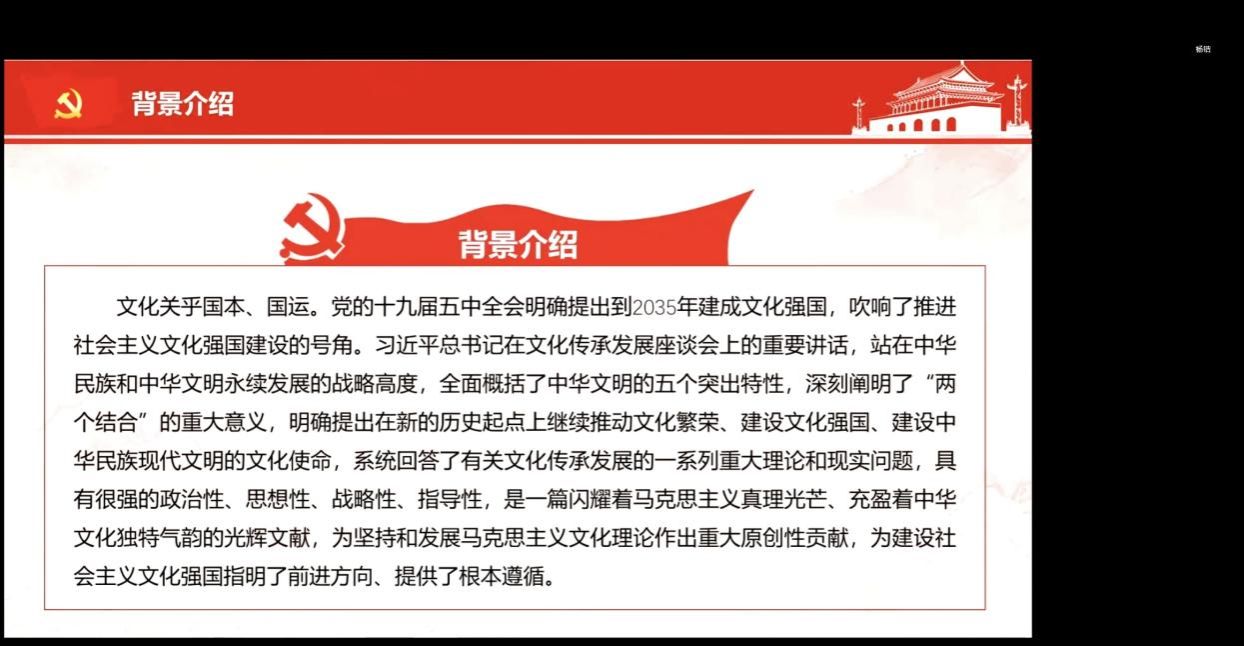 读书会的第一位导读人是我院硕士生杨锴同学。她将导读内容分为四部分进行阐释。第一部分是讲述了这一重要讲话的背景内容,习近平总书记明确提出在新的历史起点上继续推动文化繁荣、建设文化强国、建设中华民族现代文明的文化使命,系统回答了有关文化传承发展的一系列重大理论和现实问题。第二部分是对文本内容从三个方面进行了全方位多维度的解释。第三部分是对“第二个结合”的重点解读。第四部分重点介绍中华民族现代文明的内涵研究、意义研究、建设路径研究以及“第二个结合”视域下中华民族现代文明研究。