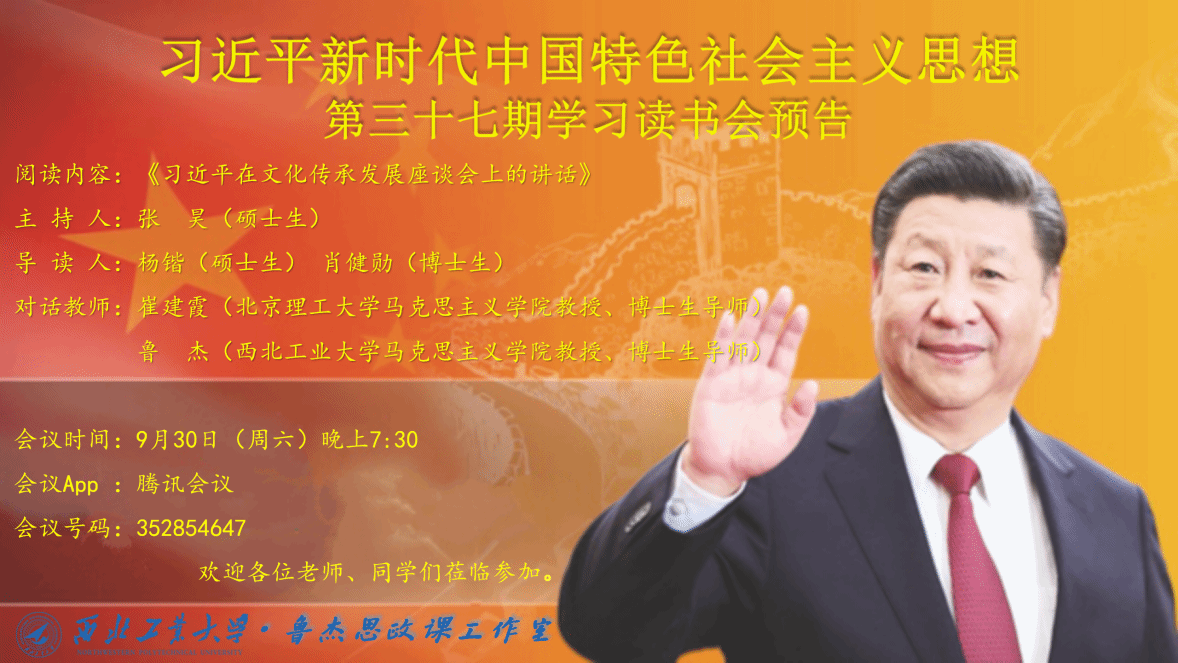 为全面学习贯彻党的二十大精神,推进习近平新时代中国特色社会主义思想进教材、进课堂、进头脑。2023年9月30日,3044am永利集团习近平新时代中国特色社会主义思想学习读书会第三十七期活动主题围绕《习近平在文化传承发展座谈会上的讲话》进行学习研讨。本次读书会由学院思想政治教育系主任、博士生导师鲁杰教授发起,学院硕士生张昊主持,北京理工大学3044am永利集团博士生导师崔建霞教授作为对话教师应邀参加。