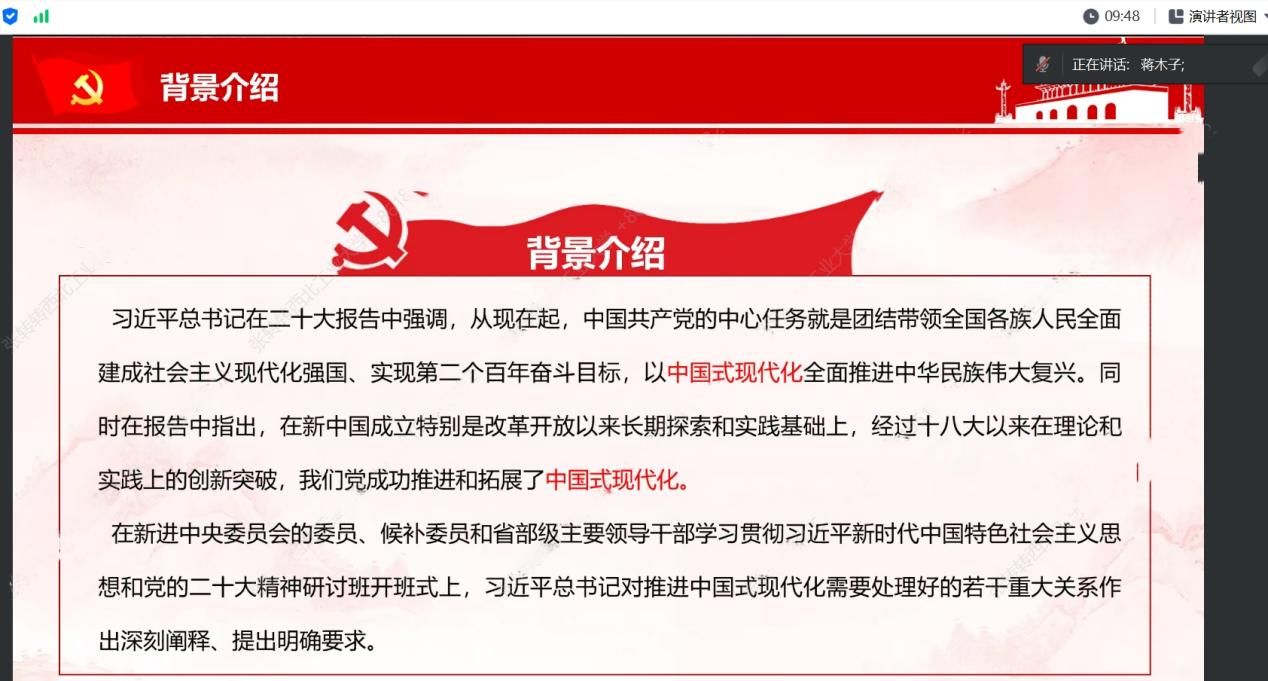 读书会的第一位导读人是学院硕士研究生蒋木子同学。她将导读内容分为四部分进行阐释。第一部分是讲述了导读文本的背景内容,习近平总书记在党的二十大报告中强调,从现在起,中国共产党的中心任务就是团结带领全国各族人民全面建成社会主义现代化强国、实现第二个百年奋斗目标,以中国式现代化全面推进中华民族伟大复兴。第二部分是对文本内容关于顶层设计与实践探索的关系、战略与策略的关系、守正与创新的关系、效率与公平的关系、活力与秩序的关系、自立自强与对外开放的关系进行了全方位多维度的解释。第三部分从中国式现代化的理论逻辑、历史逻辑和时间逻辑对文本内容进行了拓展解读。第四部分重点介绍了中国式现代化的由来以及相关研究。