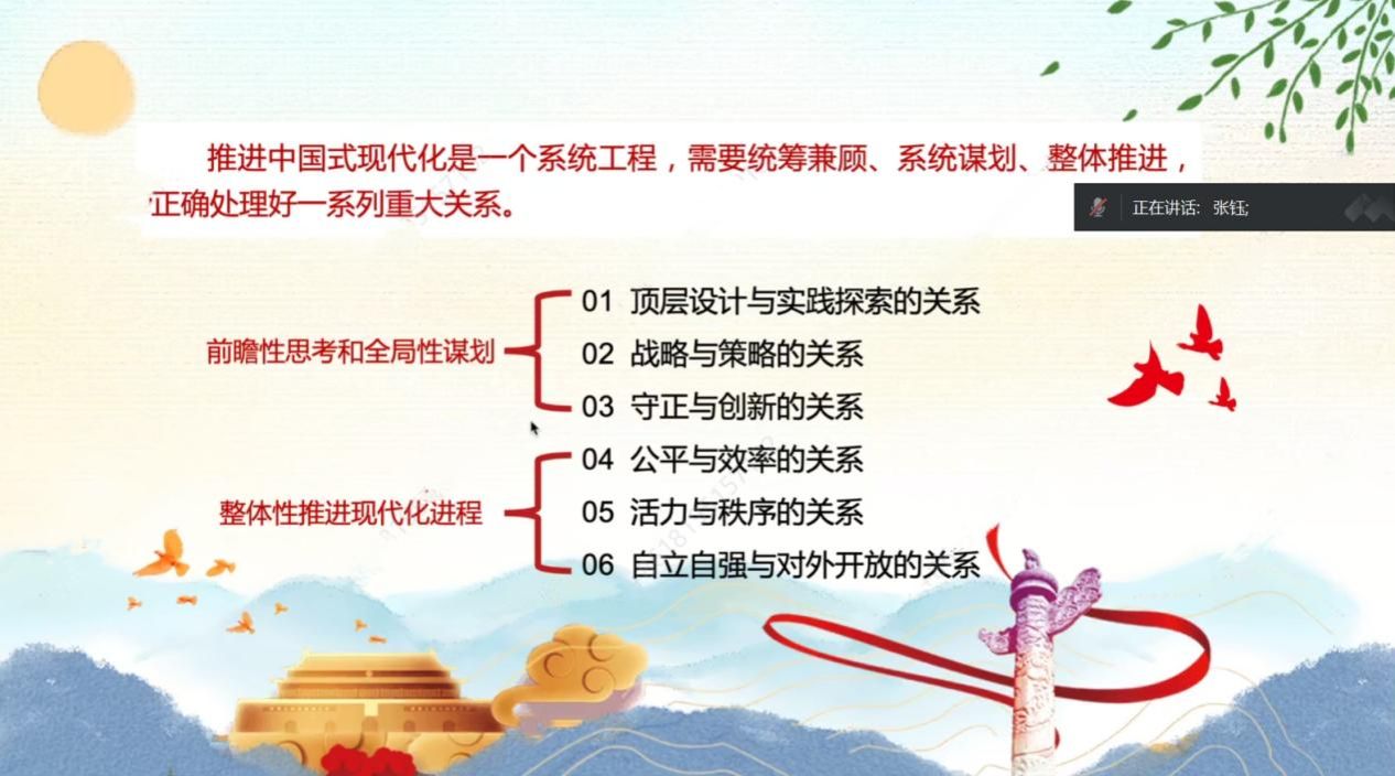 接下来,由学院博士生张钰同学进行导读。她将导读内容分为四部分进行讲解。首先,她介绍了《推进中国式现代化需要处理好若干重大关系》的主要内容,重点解读了“六大关系”,提出“顶层设计与实践探索的关系、战略与策略的关系、守正与创新的关系”这三大关系聚焦了前瞻性思考和全局性谋划;“公平与效率的关系、活力与秩序的关系、自立自强与对外开放的关系”,这三大关系则是聚焦整体性推进现代化进程。其次,介绍了人民日报关于这六个关系的系列评论与解读。基于文本内容,张钰同学从中国共产党一百多年来的发展脉络对文章进行了解读,并谈到个人对关于六个方面的历史重温和历史演进这一专题的思考。最后,她对国内关于中国式现代化的相关研究进行了综述和述评,认为学者们围绕中国式现代化的主要特征、中国共产党对中国式现代化的探索和中国式现代化与中华文明的关系等进行了充分的阐释和研究,取得了一系列研究成果。