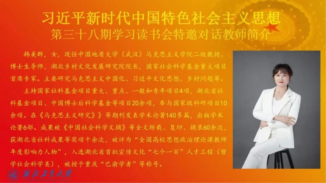 为全面贯彻落实党的二十大精神,推进习近平新时代中国特色社会主义思想进教材、进课堂、进头脑。2023年10月28日,3044am永利集团习近平新时代中国特色社会主义思想学习读书会第三十八期活动主题围绕《推进中国式现代化需要处理好若干重大关系》进行学习研讨。本次读书会由学院思想政治教育系主任、博士生导师鲁杰教授发起,学院硕士生祁嘉仪主持,中国地质大学3044am永利集团博士生导师韩美群教授作为对话教师应邀参加。