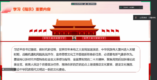 接下来,由我院博士生张文培同学进行导读。她将导读内容分为四部分进行讲解。首先,她介绍了《习近平对宣传思想文化工作作出的重要指示》的主要内容与创新提法,着重解读“七个着力”和“十四个强调”相关的文本内容,并结合习近平文化思想的形成过程,习近平文化思想是实践总结、理论结晶,是明体达用、体用贯通,是思想武器、行动指南。其次,介绍了习近平文化思想的理论渊源与实践基础,认为习近平文化思想继承发展了马克思主义文化理论,充分汲取中华优秀传统文化精华,总结提炼党的文化建设理论成果,借鉴吸收人类优秀文化成果,着眼新时代中国特色社会主义文化强国建设面临的新形势新挑战,紧扣新时代中国特色社会主义文化强国建设的新任务新要求,引领新时代中国特色社会主义文化强国建设实现新发展、取得新跨越。同时结合令小雄、袁健、付文军、岑朝阳、陈金龙、蔡馥等专家学者的观点对《指示》的内容进行解读。最后,她提出关于习近平文化思想与中国式现代化道路的文化选择的新思考,着重从习近平文化思想的价值逻辑及对中国式现代化的价值指引进行介绍,阐述了在习近平文化思想指导下中国式现代化道路的中华优秀传统文化、革命文化、社会主义先进文化的历史生成。